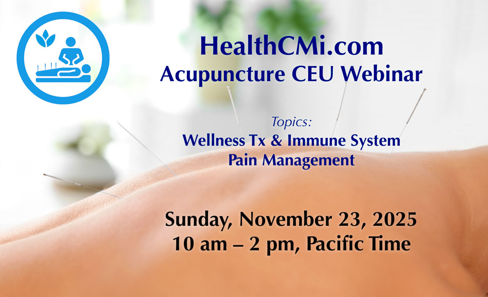 This acupuncture webinar reviews modern research on acupuncture for pain relief and wellness, including support for immune system health. Participants explore acupuncture point selections and Chinese medicine procedures that enhance clinical outcomes. All attendees participate through HealthCMi.com and receive a certificate of completion.